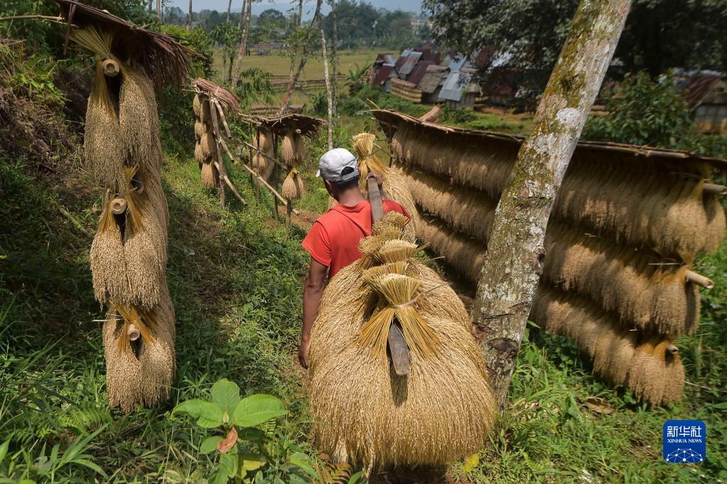 8月9日,农民在印度尼西亚万丹省奇托雷克村搬运稻谷。