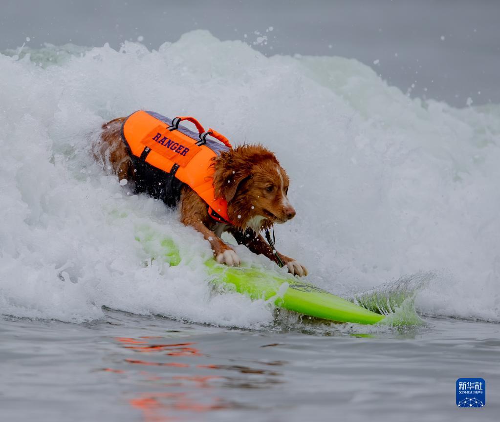 8月6日,在美国加州旧金山湾区帕西菲卡,一只狗狗参加冲浪比赛。