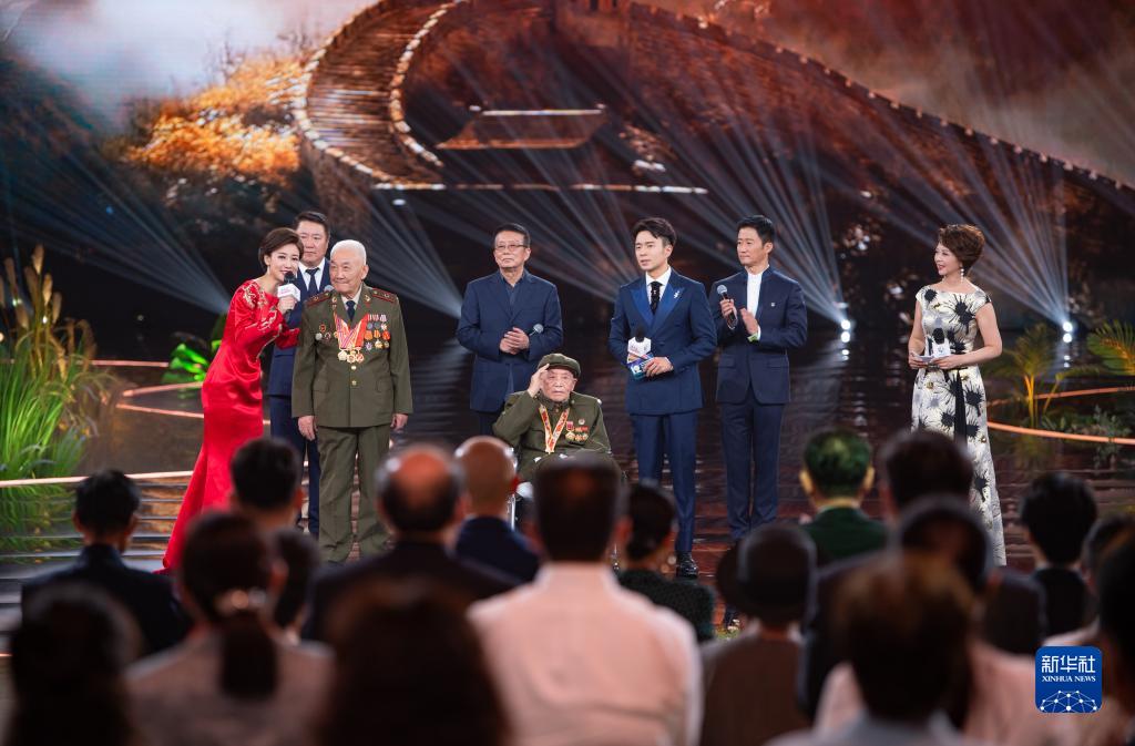 8月12日,电影《长津湖》剧组成员于冬、黄建新、吴京(左二、四、七)与抗美援朝老兵梅门造(左三)、何宗光(左五)在开幕式“特别荣誉”环节上。