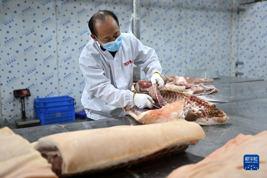 8月13日,三亚美菜网配送网点的工作人员在处理冷鲜肉。
