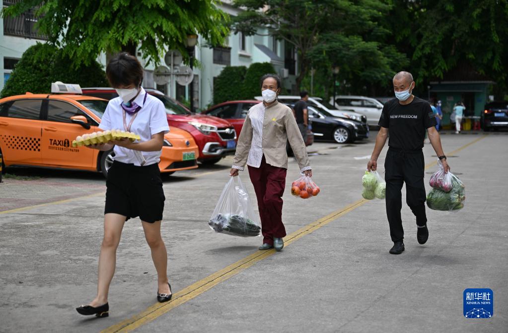 8月13日,三亚市一个小区的物业工作人员(左一、左二)帮居民将生活物资送往家中。