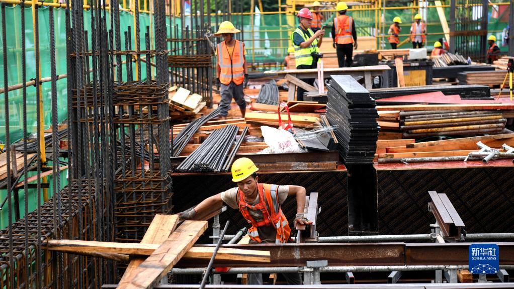 在南玉高铁玉林北站工地,工人们在铺设三层楼面(8月12日摄)。