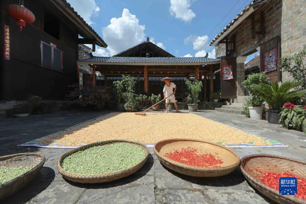 8月13日,村民在贵州省黔东南苗族侗族自治州岑巩县注溪镇衙院村晾晒玉米、辣椒等农作物。