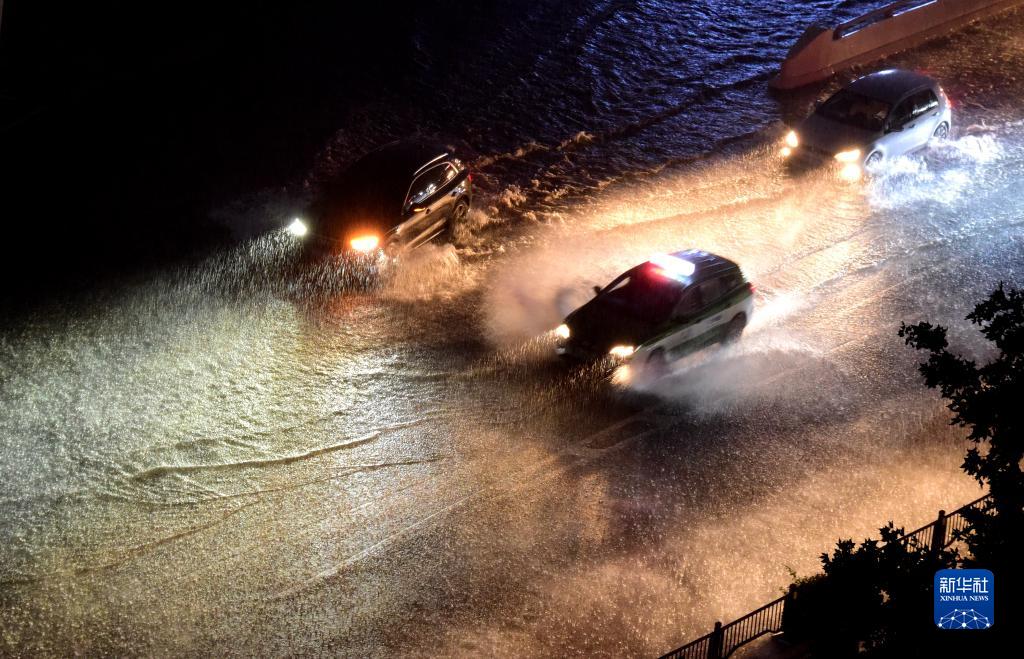 8月8日,汽车在郑州市花园路上涉水行驶。