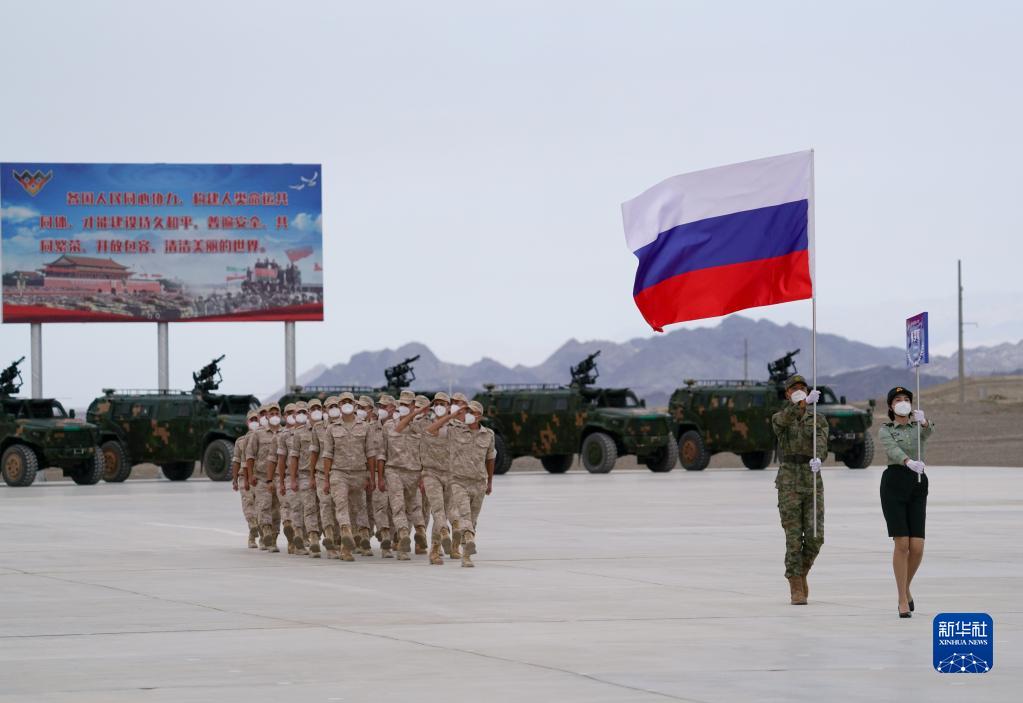 8月13日,“国际军事比赛-2022”中国库尔勒赛区比赛开幕,俄罗斯参赛队走过主席台。新华社发(栾铖 摄)