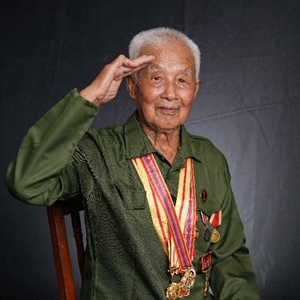 6月21日,在江苏省泰兴市,抗战老战士陈乔抚摸纪念章。新华社记者 李博 摄