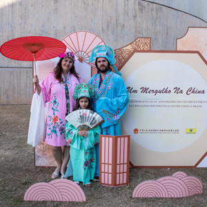 8月13日,在巴西首都巴西利亚举办的“中国一瞬”文化体验周活动上,人们体验京剧服饰。