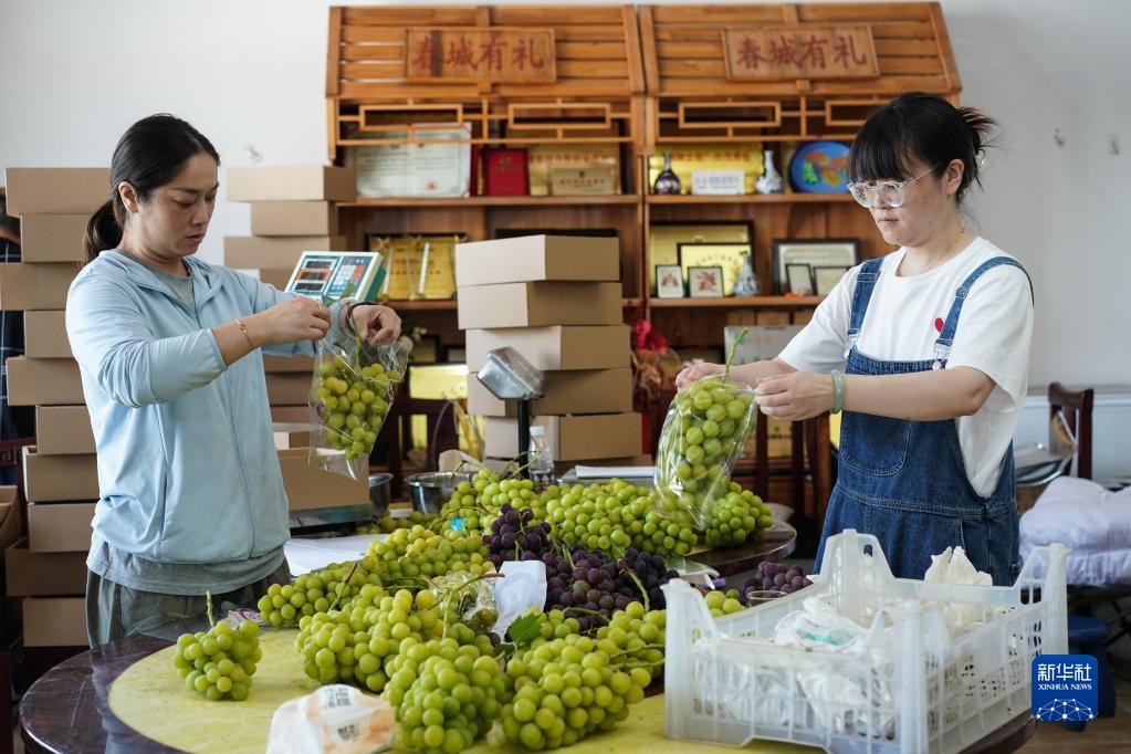 8月13日,王娟(左)和回家省亲的妹妹王月在合作社包装葡萄。