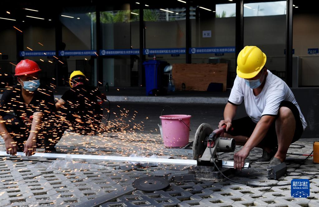 8月14日,工人在三亚第三方舱医院作业。