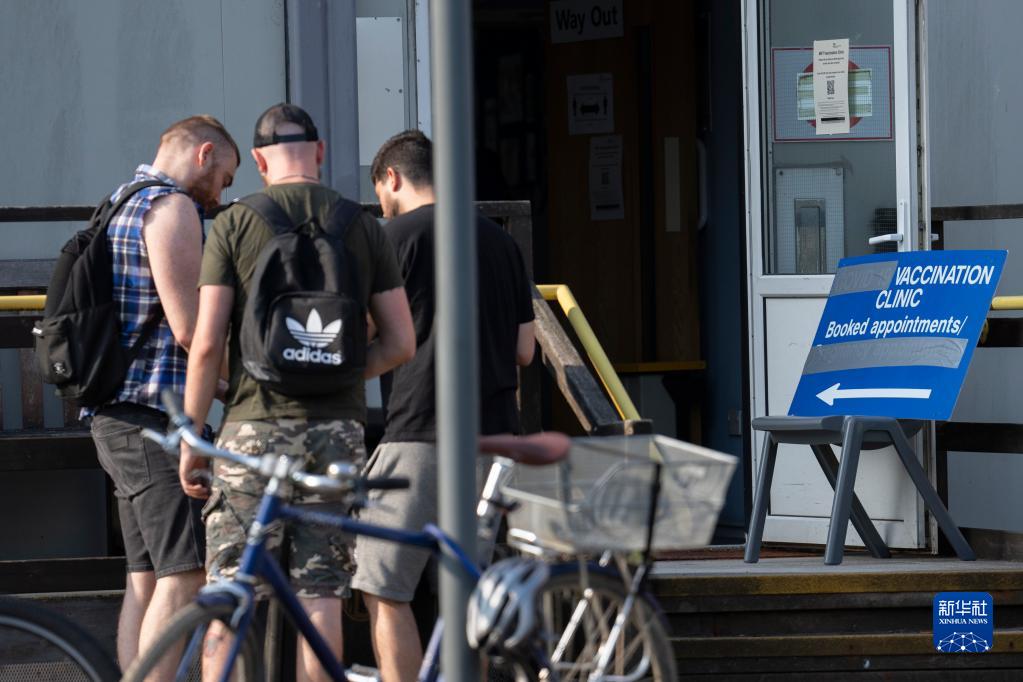 8月14日,人们在英国曼彻斯特一处猴痘疫苗接种点外排队等待接种疫苗。