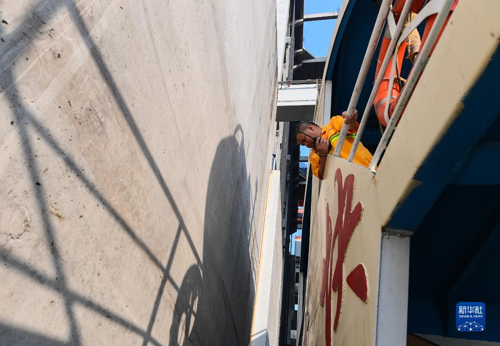 民快轮通过葛洲坝船闸时,船长刘勇在船舷处通过对讲机指挥驾驶室舵工操作。满载货物3000吨的民快轮进入闸室后,两侧距离闸箱均不足1米,对指挥和驾驶提出极高的要求(8月10日摄)。