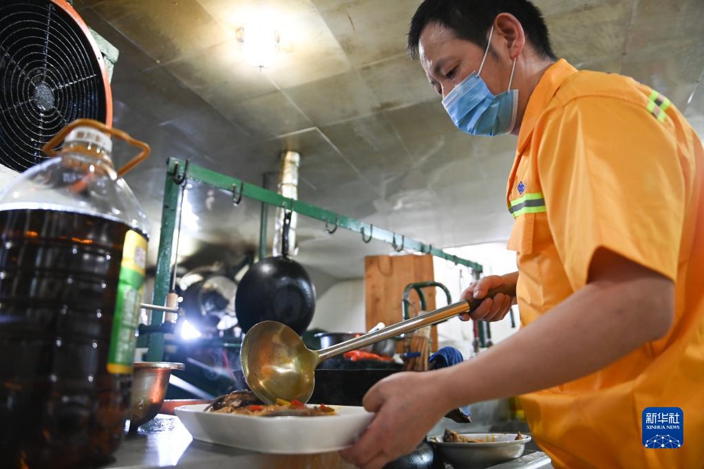 民快轮餐务员李文春在准备饭菜(8月10日摄)。