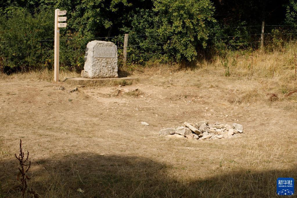 这是8月14日在英国赛伦塞斯特附近拍摄的干涸的泰晤士河发源地和一块写有“泰晤士河起点”的石碑。
