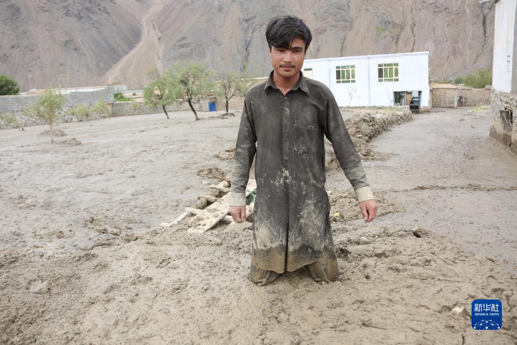 8月15日,在阿富汗东部帕尔万省,一名男子站在洪水中。