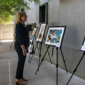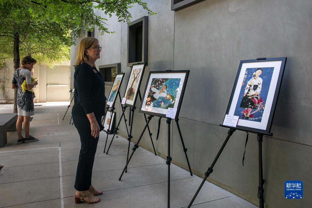 8月14日,在美国得克萨斯州达拉斯市举行的世界“慰安妇”纪念日活动上,观众观看以“慰安妇”为主题的画展。新华社发(金新 摄)