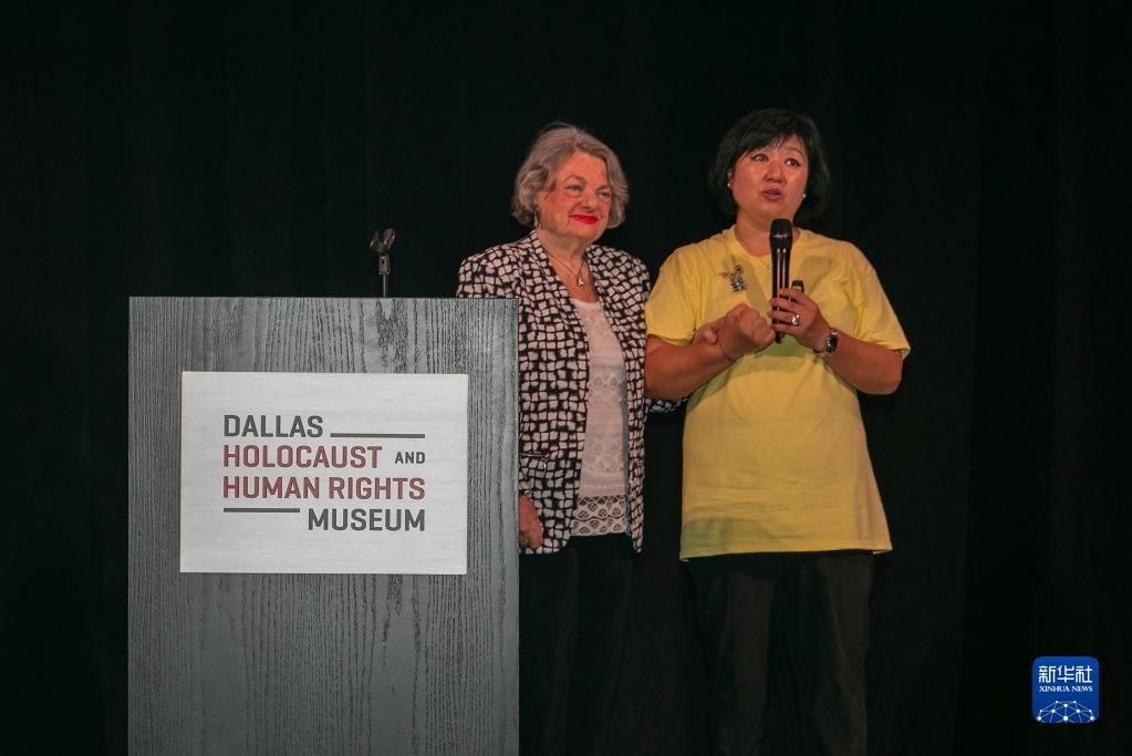 8月14日,在美国得克萨斯州达拉斯市举行的世界“慰安妇”纪念日活动上,活动组织者之一朴申敏(右)和纳粹大屠杀幸存者罗希安·策纳参加活动。新华社发(金新 摄)