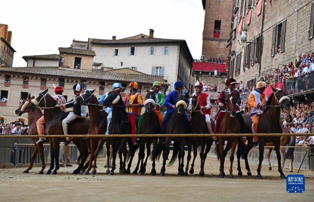 8月15日,骑手在意大利锡耶纳田野广场上参加赛马节热身赛。