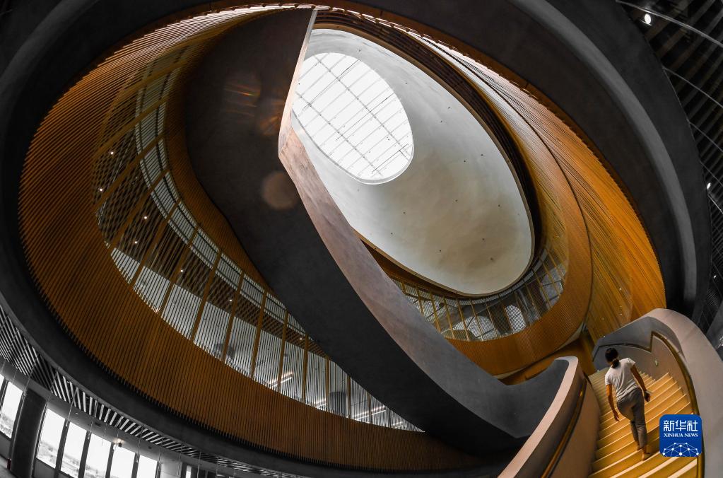 一名工作人员行走在香港科技大学(广州)图书馆的楼梯上(8月16日摄)。