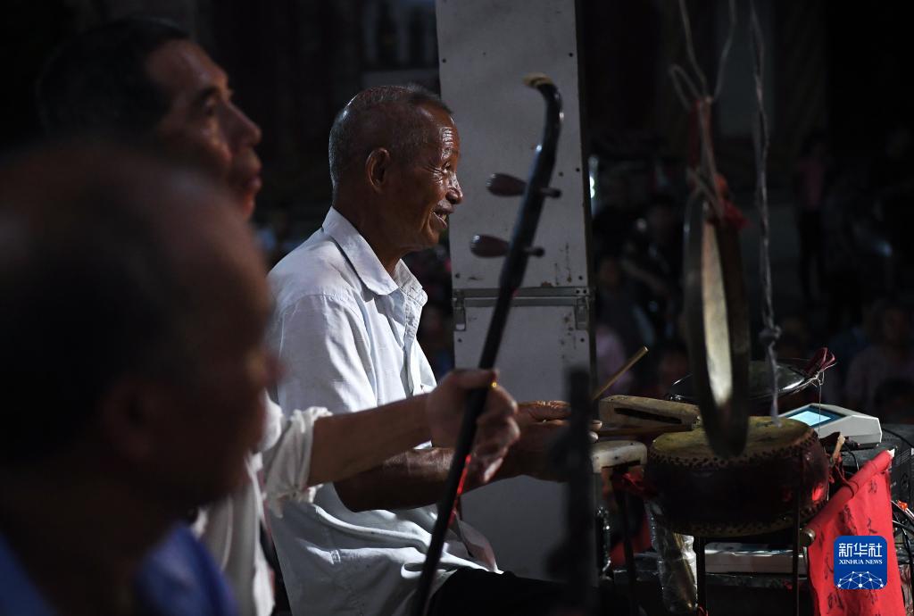 在江西省广昌县塘坊镇大株村,木偶剧团老成员谢家胜在演出中(8月10日摄)。
