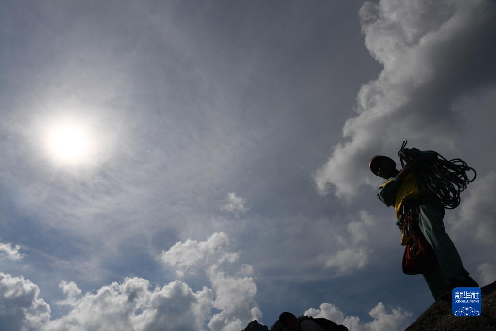 8月14日,李培生在黄山风景区的悬崖峭壁间清捡完垃圾准备离开。