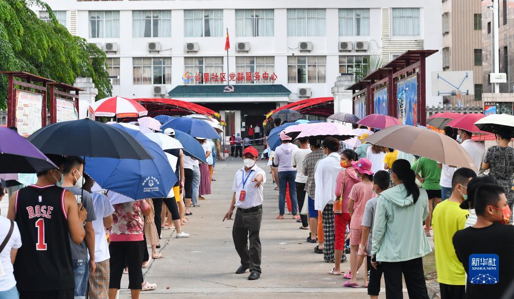 工作人员(中)在万宁市万城镇长星社区一处核酸采样点维持秩序(8月13日摄)。