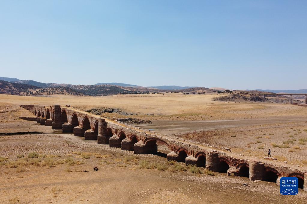 这是8月15日用无人机拍摄的干涸的西班牙锡哈拉水库,上世纪50年代因水库落成而被淹没的梅斯塔古桥重见天日。