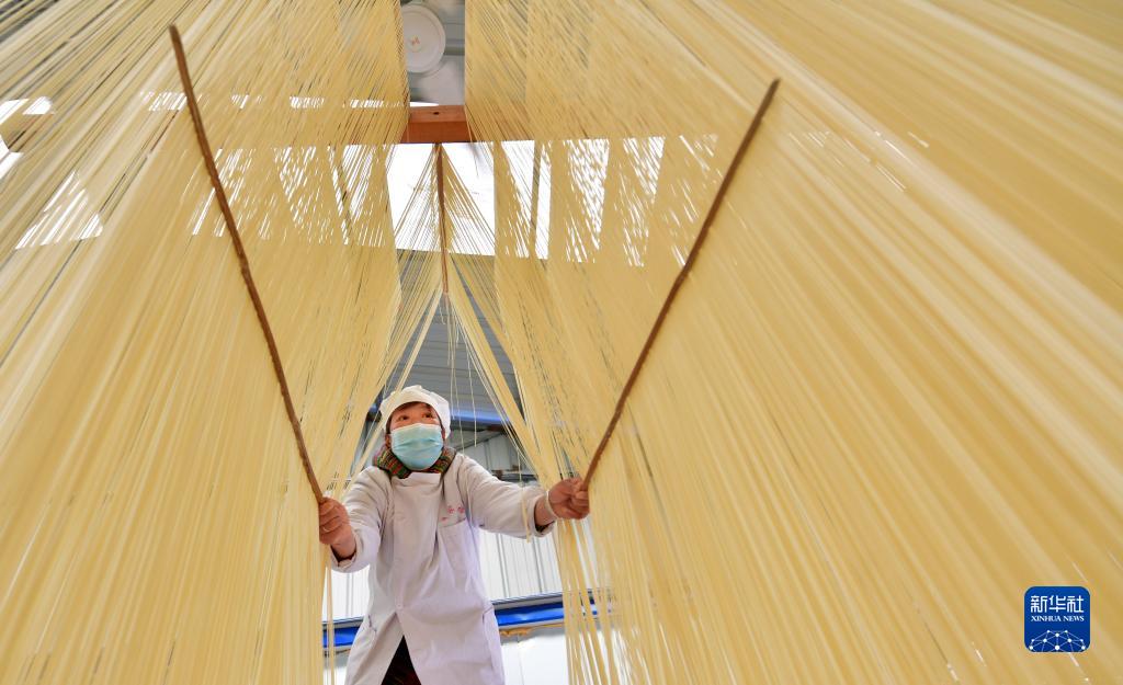 村民在李长满的老李家手工挂面专业合作社晾晒空心挂面(3月18日摄)。