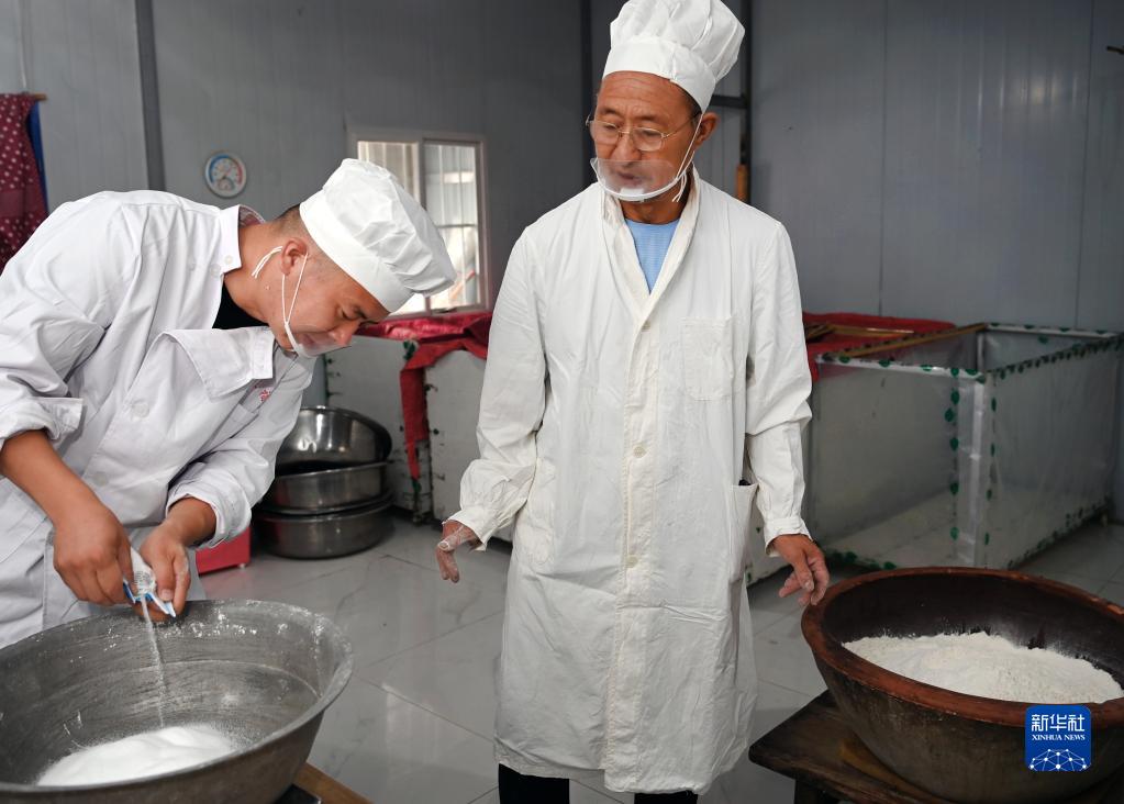 8月16日,李长满(右)和儿子李念平在准备制作空心挂面原料。