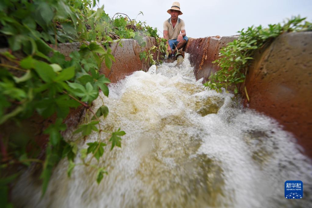 在江西省永修县吴城镇丁山村,村民用水泵抽水灌溉农田(8月16日摄)。