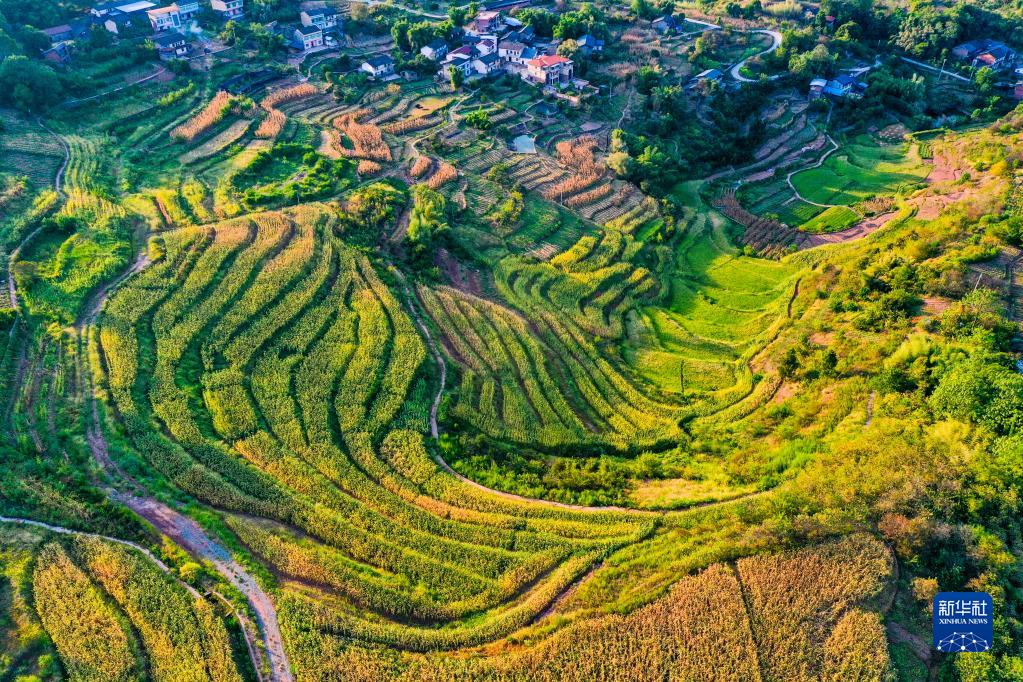 时下,重庆市北碚区三圣镇是平村的水稻、高粱等农作物相继进入成熟期。稻田、高粱地、玉米地、民居等相映成趣,美如画卷。