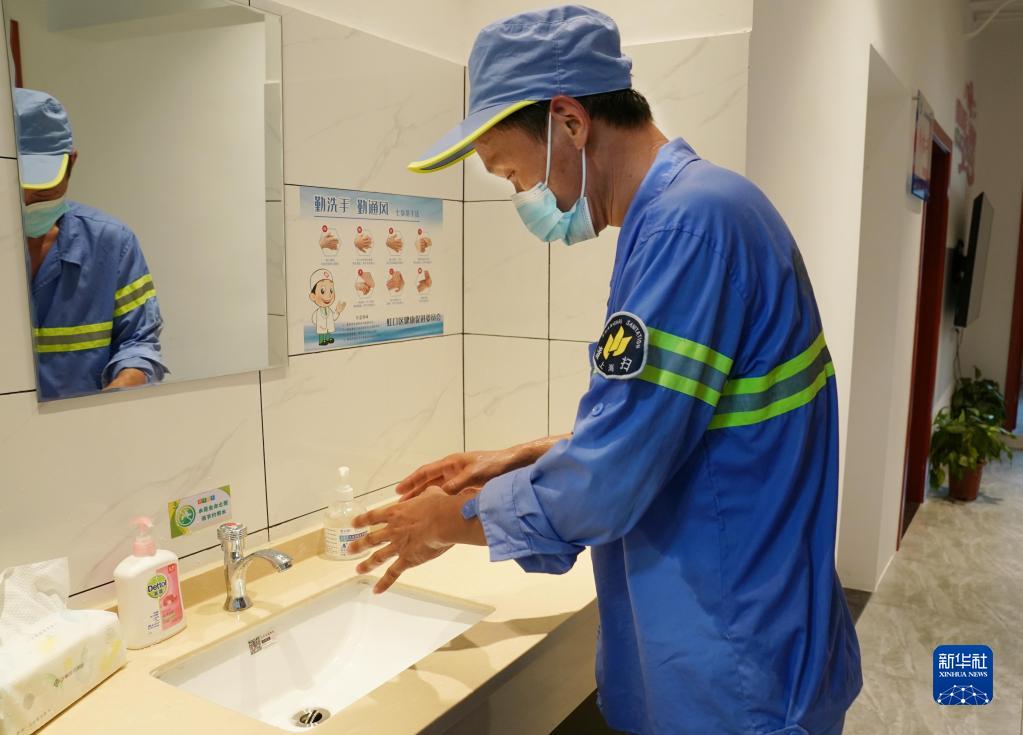 8月16日,来爱心驿站休息的环卫工人冉景涛在水池前洗脸,他的上衣已被汗水浸透。