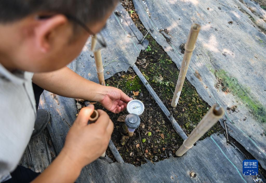 8月17日,在四川省眉山市彭山区公义镇,技术人员在大棚内监测土壤水分情况。