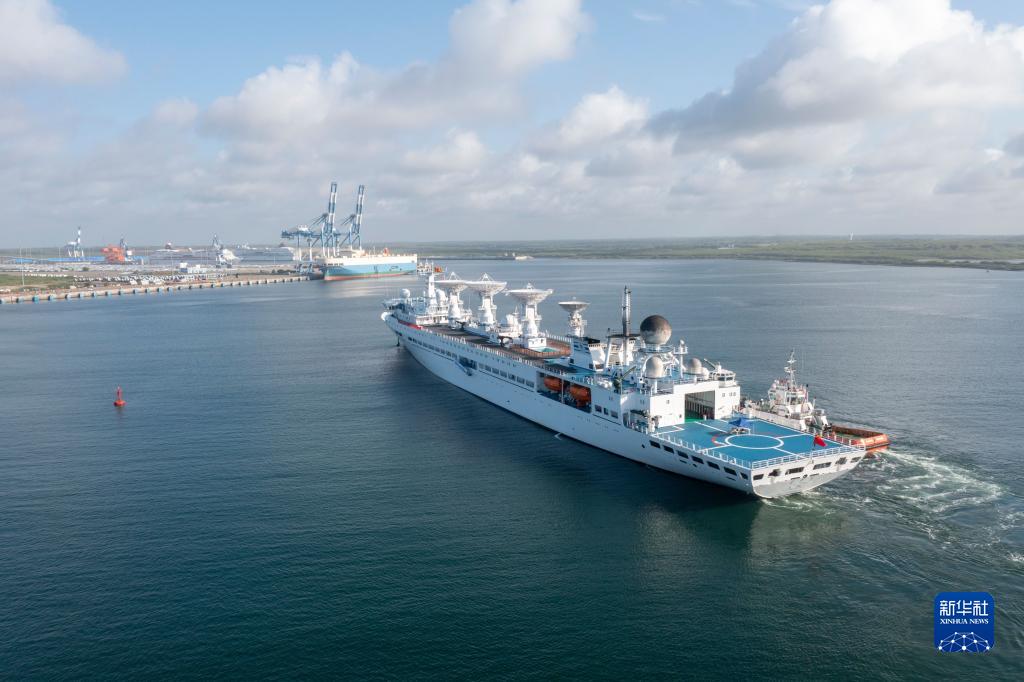 中国远望5号船16日停靠斯里兰卡南部汉班托塔港,进行物资补给。中国驻斯大使戚振宏和斯政府官员、中资机构代表等在码头迎接。