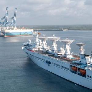 这是8月16日在斯里兰卡南部汉班托塔港附近拍摄的中国远望5号船。