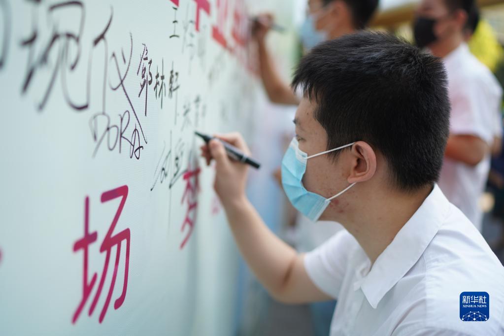 在位于南昌的江科附中高中部毕业典礼上,刘熙鸿在签名墙签名(8月13日摄)。