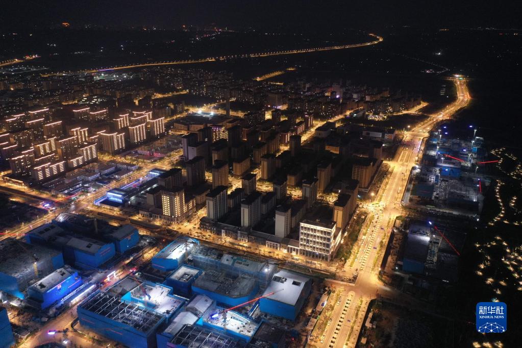 河北雄安新区容东片区及雄安·电建智汇城建设项目夜景(8月17日摄,无人机照片)。