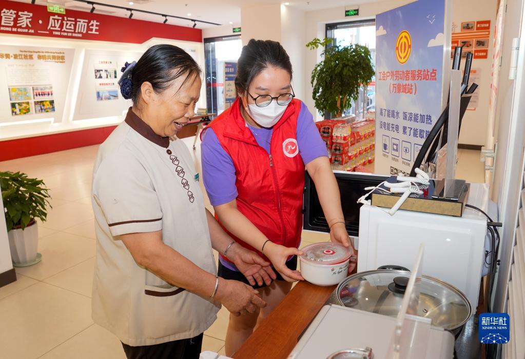 8月17日,重庆市九龙坡区谢家湾街道万象城的工会户外劳动者服务站,志愿者帮助一名物业保洁人员加热自带的午餐。