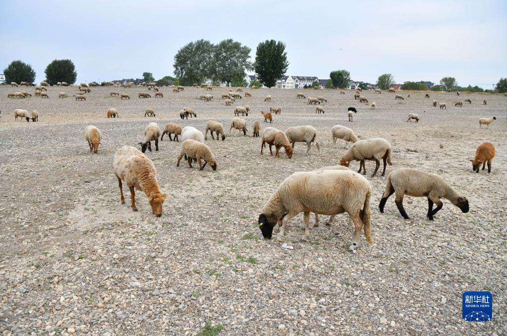 8月17日,在德国北威州杜塞尔多夫,羊群在莱茵河岸觅食。