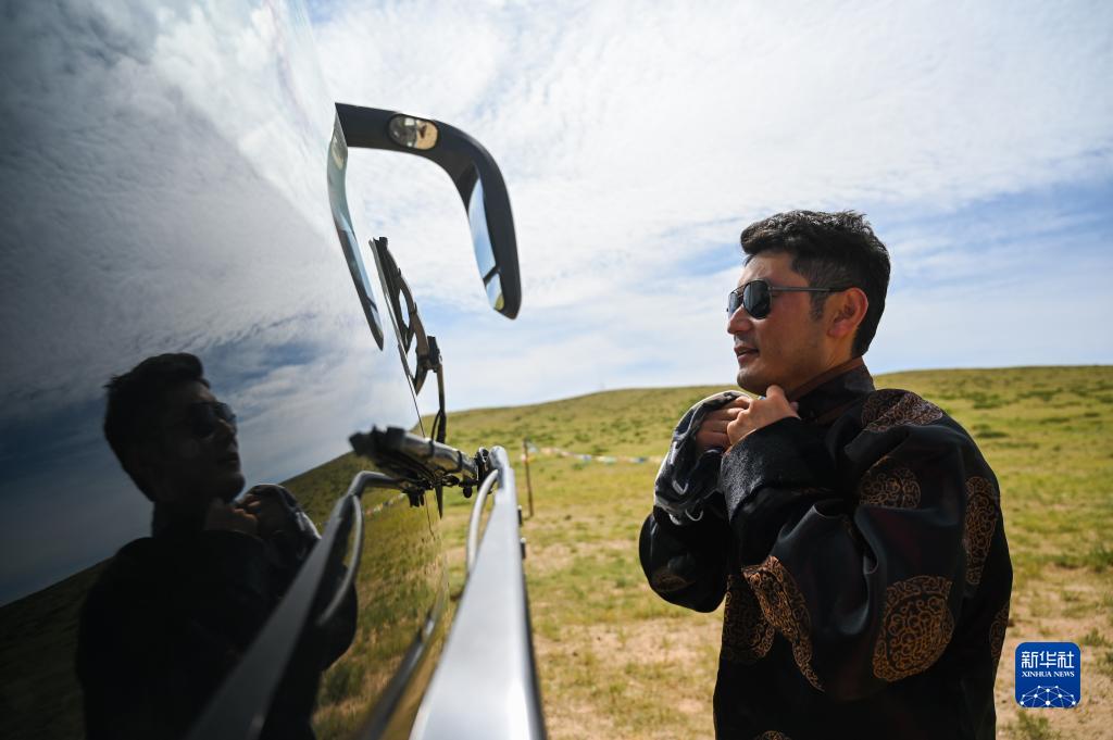 8月17日,在敦达乌苏嘎查演出点,乌兰牧骑队员在大巴车前整理服装。