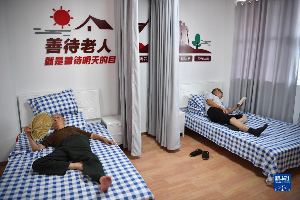 8月17日,两位老人在老县镇锦屏社区老年人日间照料中心的房间内读书休息。