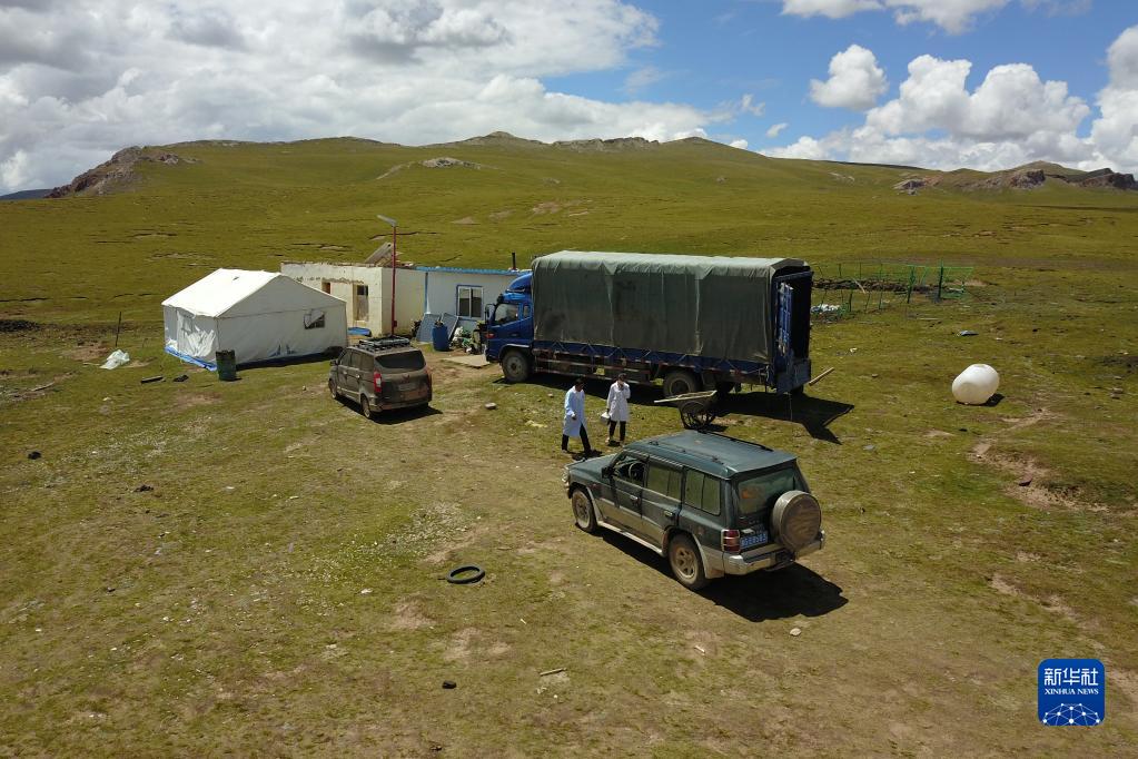 在治多县索加乡当曲村,布久索南更青(左)和同事一起前往牧民家中问诊(8月11日摄,无人机照片)。