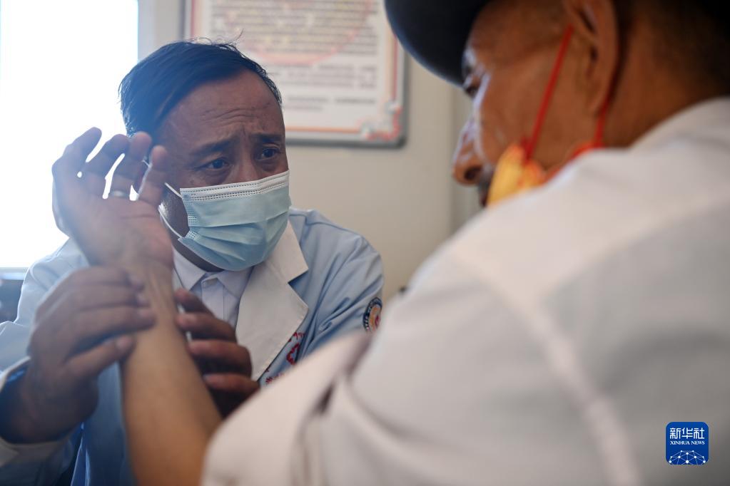 在治多县索加乡卫生院,布久索南更青(左)为患者把脉(8月11日摄)。