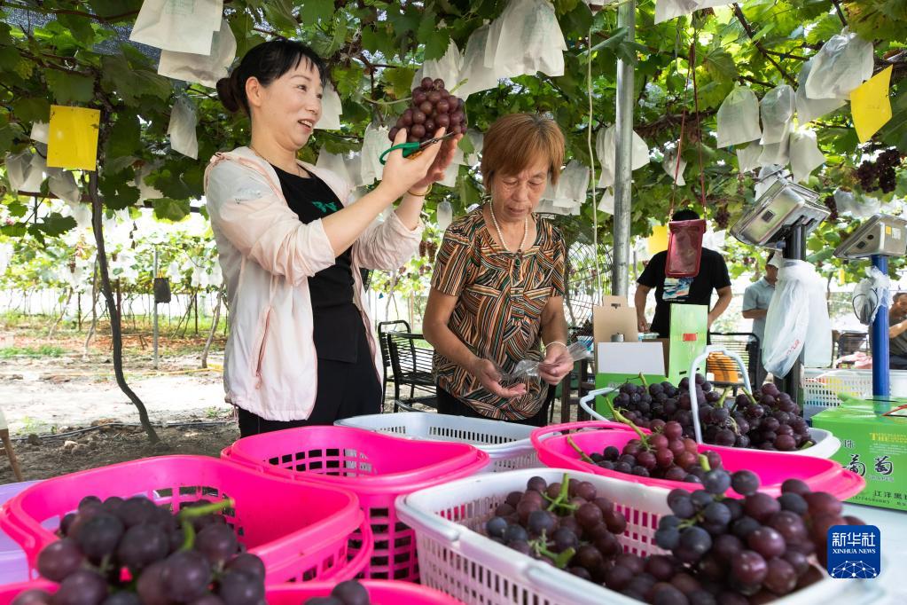 福建省福州市闽侯县大湖乡江洋村的果农在葡萄园包装采收的葡萄(8月17日摄)。