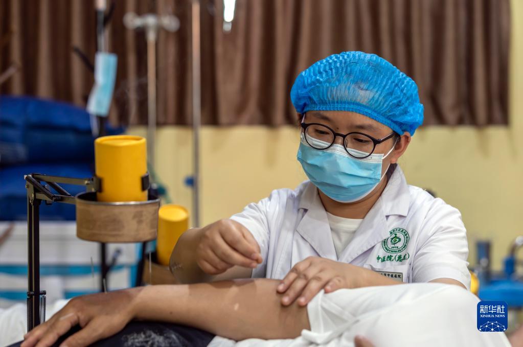 8月19日,医生在贵州省黔西市中医医院国医馆为患者进行针灸治疗。