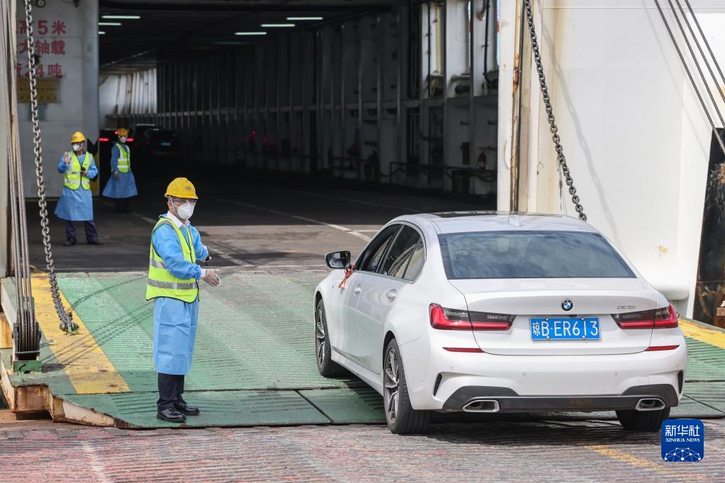 8月16日,海口新海港的服务专员引导滞留旅客的自驾车辆登船。