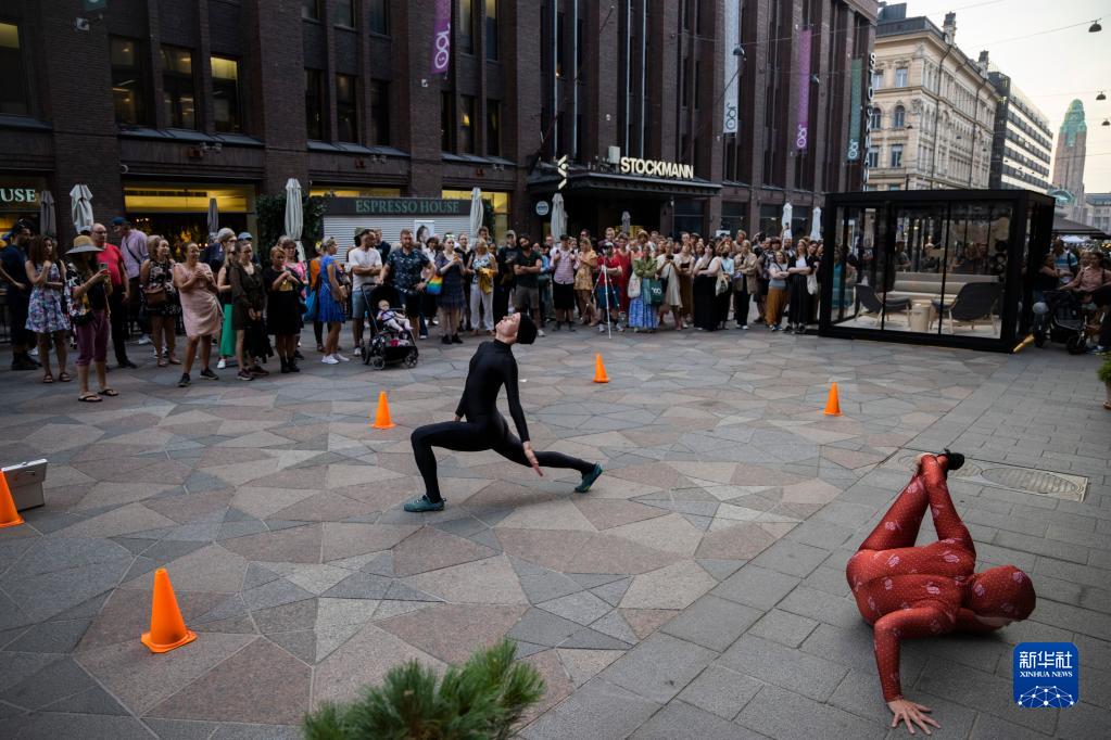 8月18日,人们在芬兰赫尔辛基街头观看现代舞表演。