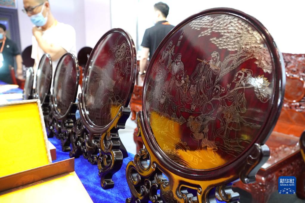 8月19日在第六届中华老字号(山东)博览会山东展区内拍摄的工艺品。