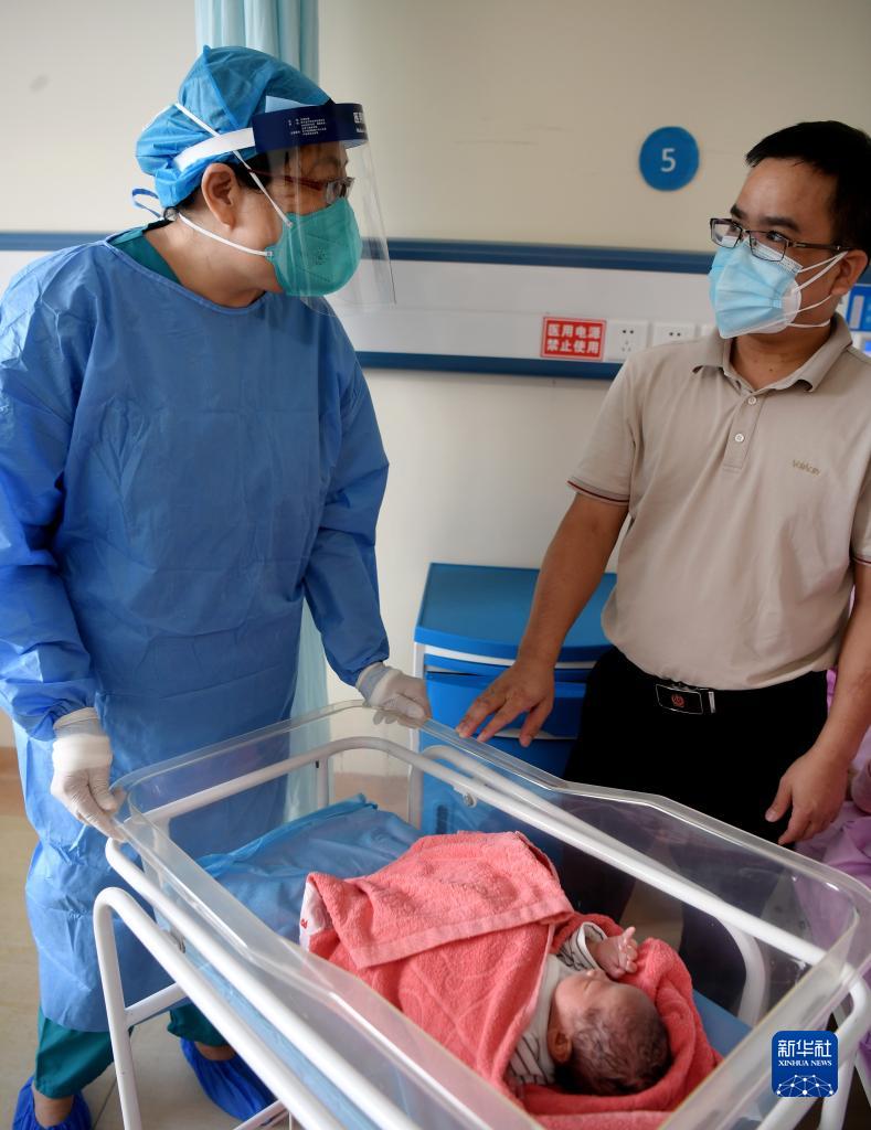 8月19日,海南三亚市妇女儿童医院妇产科主任医师田秀娟(左)在住院部了解新生儿健康状况。