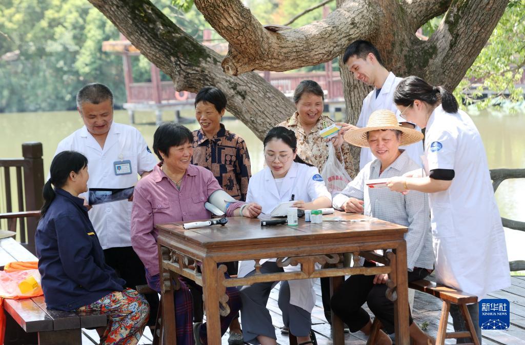 8月19日,在浙江省湖州市德清县禹越镇三林村,镇卫生院医师为村民义诊。