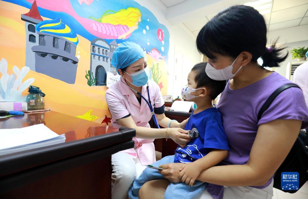 8月19日,在河北省石家庄市长安区妇幼保健院,医务人员为儿童进行入园体检。